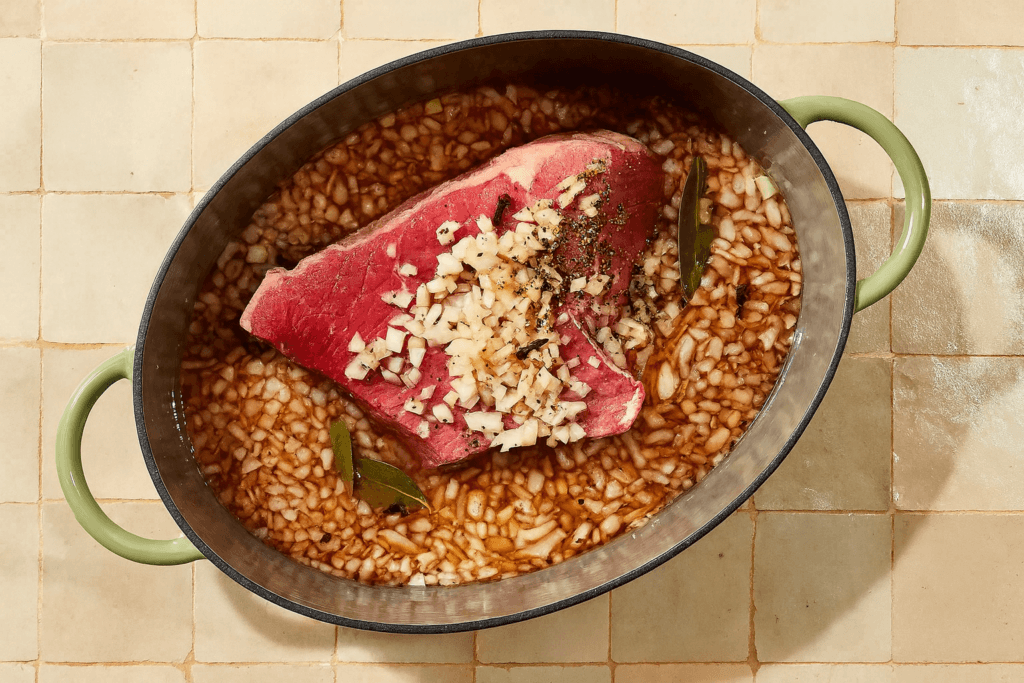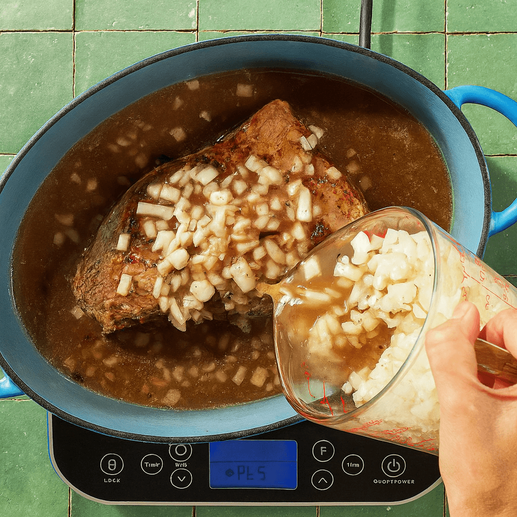 Reduce the heat to medium-low, cover, and pour the reserved marinade over the beef. From 3 1/2 to 4 hours, simmer until the beef is soft.