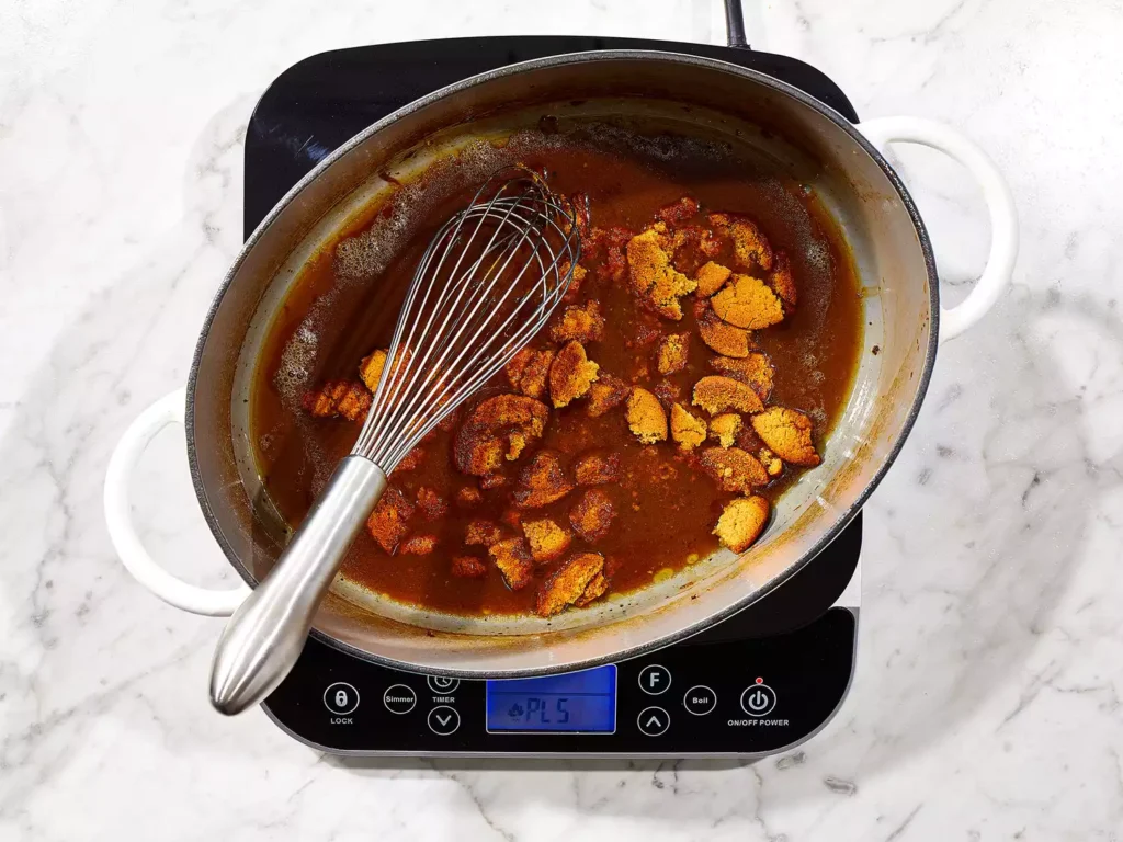 Strain out the solids from any remaining liquid and continue to cook over medium heat. Simmer for approximately 10 minutes, or until the gravy thickens, after adding gingersnap biscuits. Over sliced beef, serve gravy.