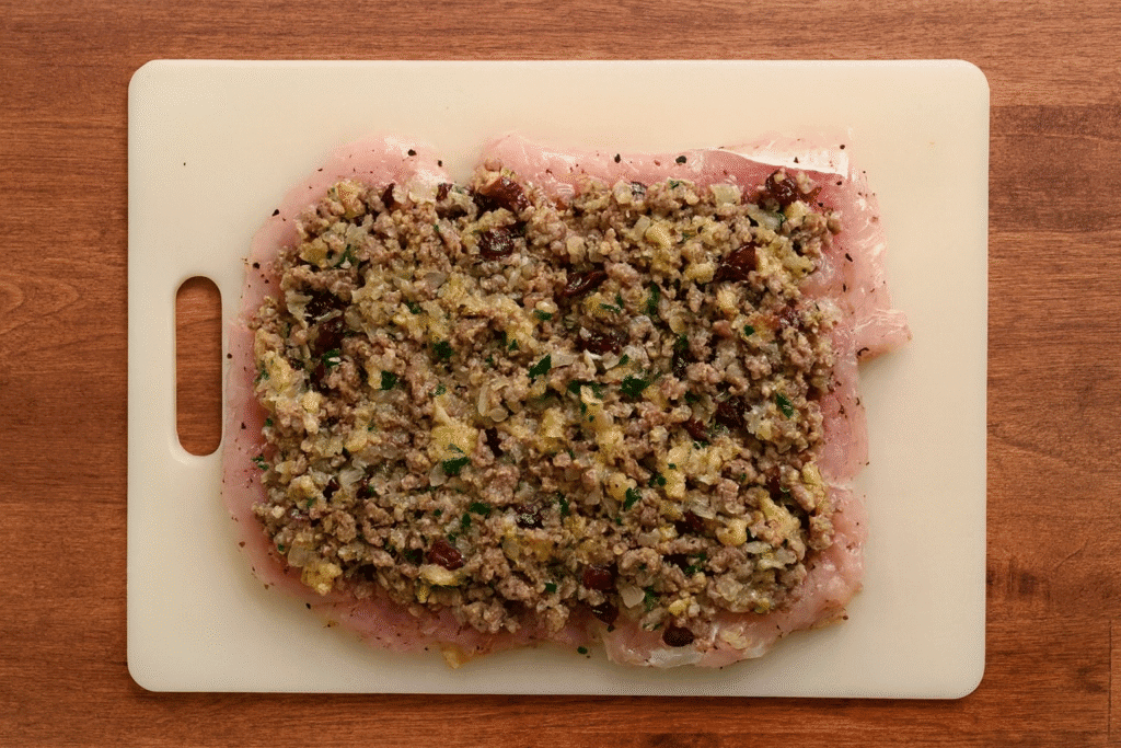 To create one big tenderloin, lay the two tenderloins next to one another, with the margins slightly overlapping. Use the meat pounder to tap the tenderloins together and seal them. Leaving a roughly 1/3-inch border around the edges, cover the filling evenly.