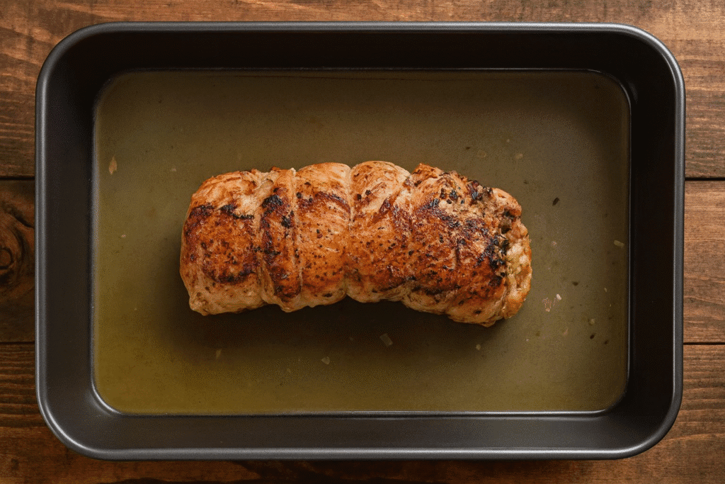 Tie the tenderloin with four or five pieces of kitchen twine to keep it together and in place after rolling it up into a tight jelly roll shape. At this point, you may cover the roulade and put it in the refrigerator to cook it later if you like.